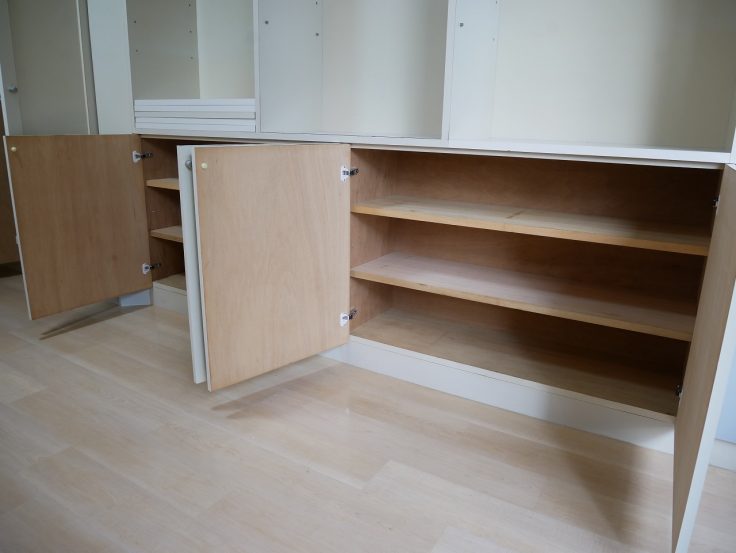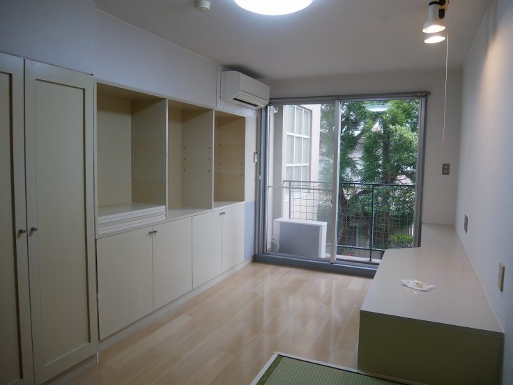 壁一面に目的に合わせて使える収納が備え付けられています★