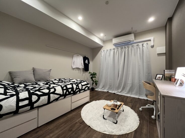 エアコン、TVモニター付きインターフォン、バストイレ別、収納、独立洗面台、キッチン(IH)、高速光インターネット、バルコニー、照明器具、CFシート、浴室乾燥機、温水洗浄便座、複合サッシ、家具家電、食堂、エレベーター、駐車場、電子レンジ、トースター、給茶機、オートロック、防犯カメラ、24時間緊急対応